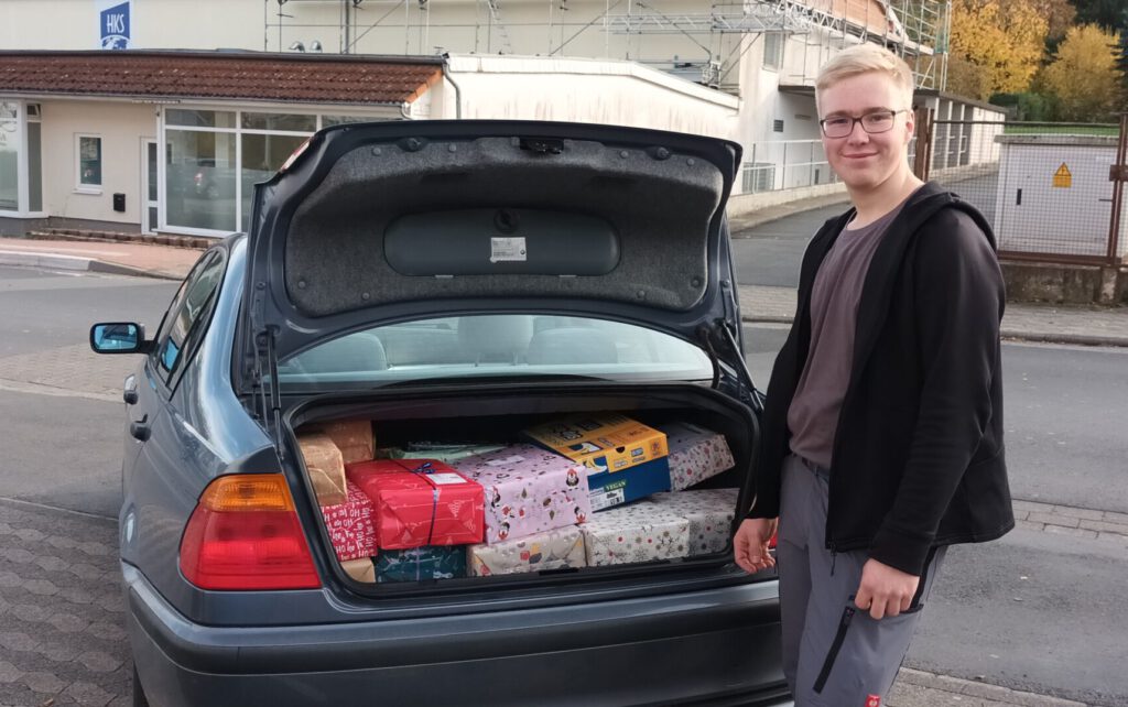 Der Stapel mit bunten Päckchen im Lehrerzimmer wurde im Oktober von Tag zu Tag größer, sodass alle wussten: Der Weihnachtspäckchenkonvoi startet bald wieder, um Kindern in den ärmsten Regionen Osteuropas zu Weihnachten eine Freude zu machen. Max Keuneke, der zum Hardegser Team dieser Aktion gehört, freute sich über den vollen Kofferraum mit Paketen, die bald per LKW auf die Reise Richtung Osten gehen.