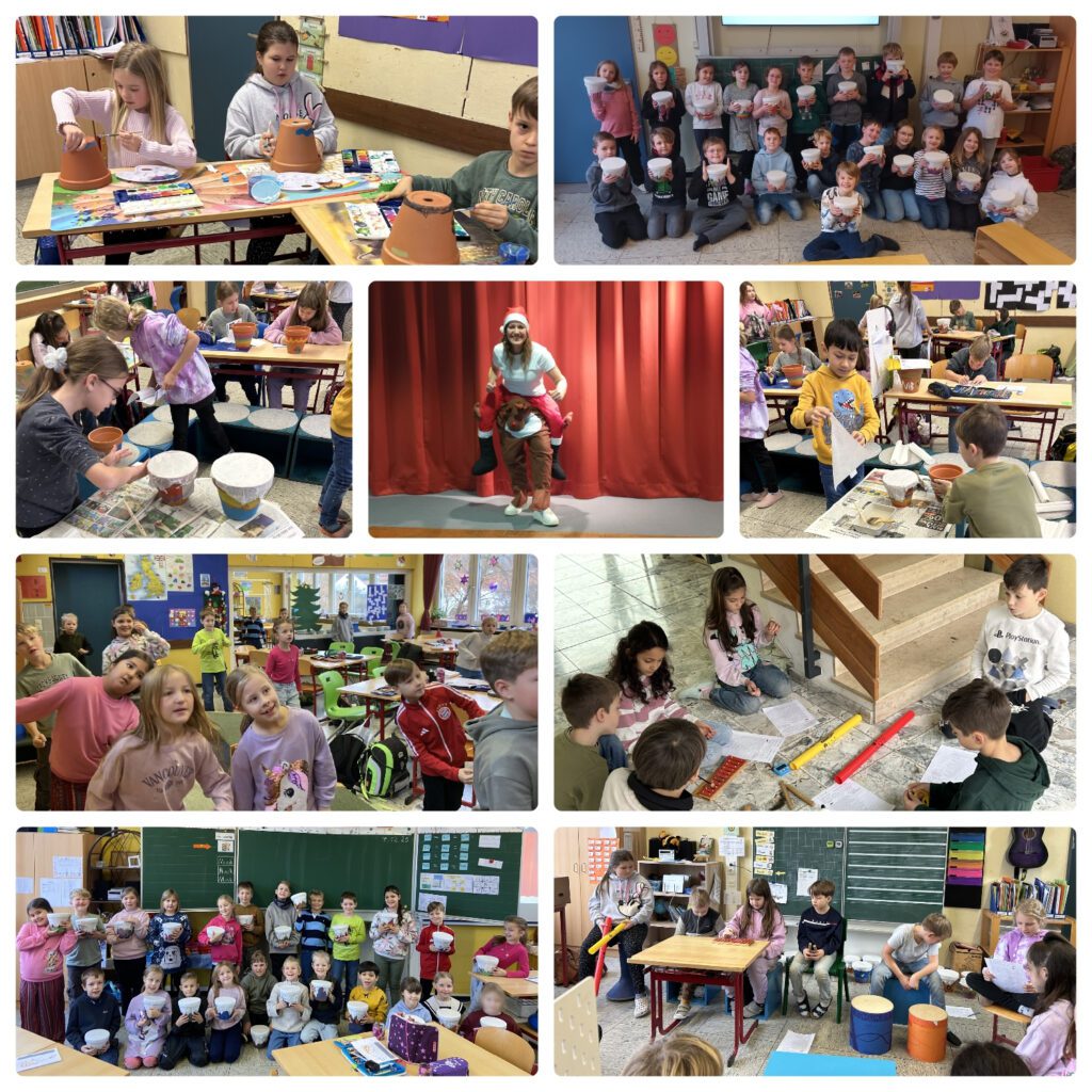 Heute war den ganzen Tag Musik aus allen Klassenräumen unserer Schule zu hören. Alle Kinder haben ein Instrument gebaut und durften es mit nach Hause nehmen: In den Eingangsstufen wurden farbenfrohe Schüttel-Röhren aus Klopapierrollen gebastelt und mit Reis befüllt. Diese wurden dann direkt erprobt und zur Begleitung eines Liedes verwendet. In den Klassen 3 und 4 wurden aus Blumentöpfen, Butterbrotpapier und Kleister Trommeln gebaut, die ebenfalls farbig gestaltet wurden. Außerdem gab es ein Bewegungsspiel zum Lied Renntiererennen von Deine Freunde und einen Christmas Dance – beides per Video angeleitet von Frau Aden in passender Kostümierung. Die jüngeren Kinder durften sich dann noch mit einem Musikstück von Émile Waldteufel beschäftigen, zu dem es Bewegungen und Malaufgaben gab, während die älteren Kinder eine weihnachtliche Klanggeschichte mit Instrumenten gestalteten und mehr über die Musik von Antonio Vivaldi erfuhren. Nebenbei haben es manche tatsächlich auch noch geschafft, ein paar Weihnachtslieder zu singen!